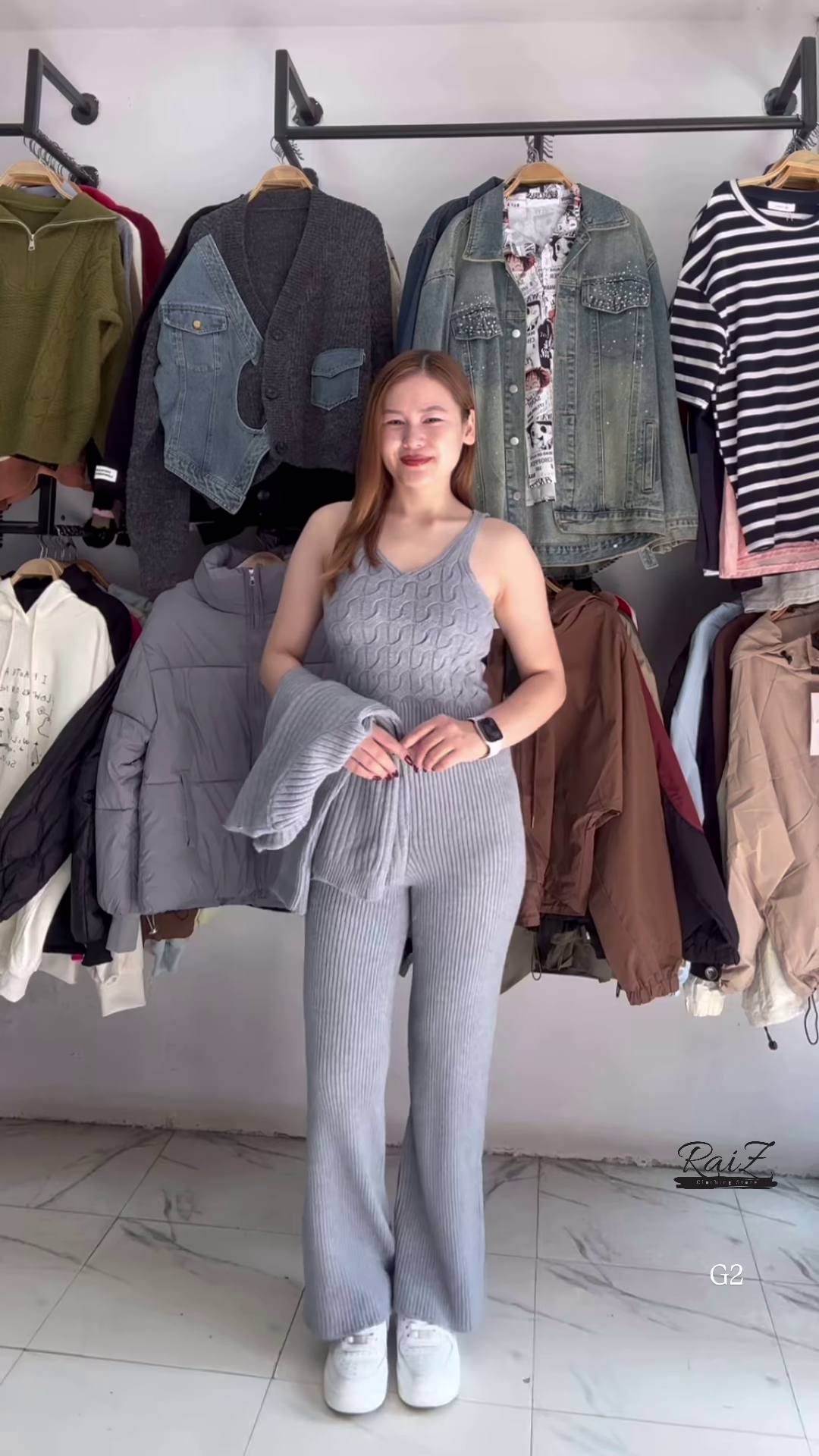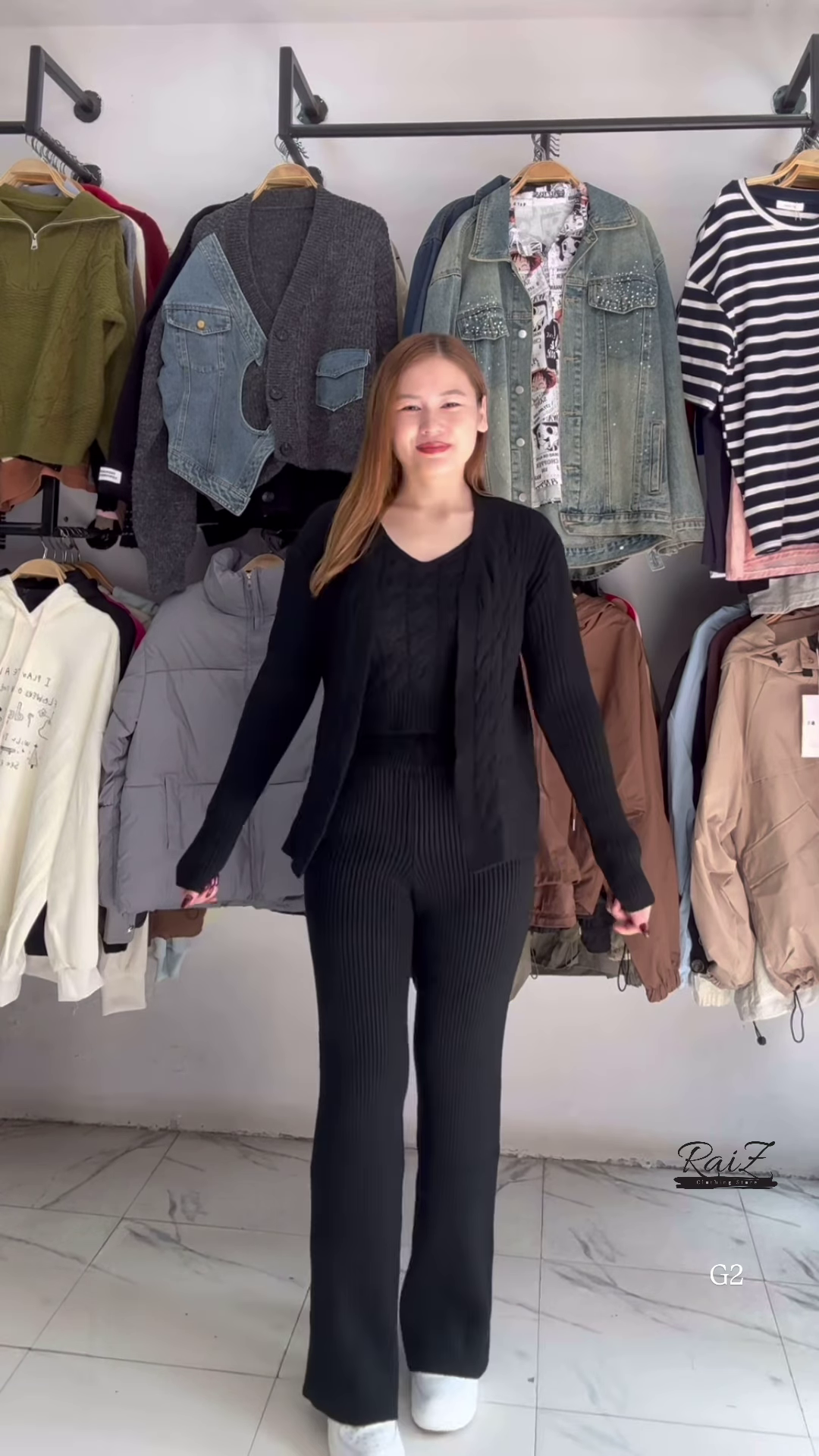 The top piece is a classic open-front cardigan featuring a sophisticated cable knit pattern. The vertical “rope” stitches not only add a beautiful texture to the garment but also create a visually slimming effect. The cardigan is designed with a relaxed, slightly oversized fit, making it perfect for layering over a basic tee or a camisole. The V-neckline is clean and modern, and the ribbed cuffs ensure a snug fit around the wrists. The craftsmanship involved in the knitting ensures that the patterns are consistent and the seams are durable, resisting pilling even after regular wear.