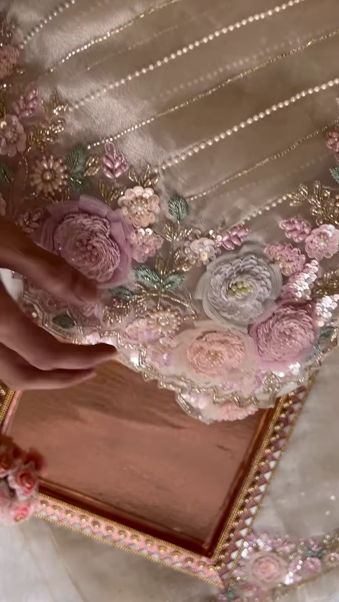 The standout feature of this gown is the stunning 3D floral work. Instead of traditional flat embroidery, this piece features hand-crafted fabric flowers in shades of blush pink, lavender, and ivory that are attached to the gown to create a three-dimensional effect. These flowers are interspersed with shimmering sequins, tiny pearls, and metallic green leaves, creating a lifelike garden appearance on the fabric. This level of detail ensures that the gown looks different and captivating from every angle.