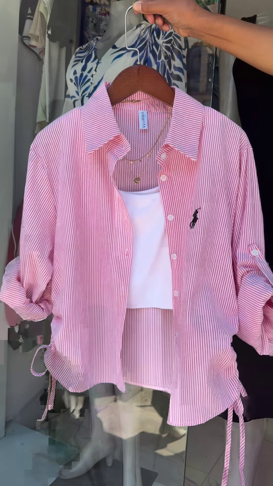 The clothing is displayed on a wooden hanger with leather accents, adding a touch of sophistication to the presentation. A delicate gold necklace is artfully draped over the ensemble, suggesting how accessories can elevate the overall look. In the background, there’s a glimpse of other garments, including what appears to be a blue and white patterned piece, indicating this is part of a carefully curated wardrobe.