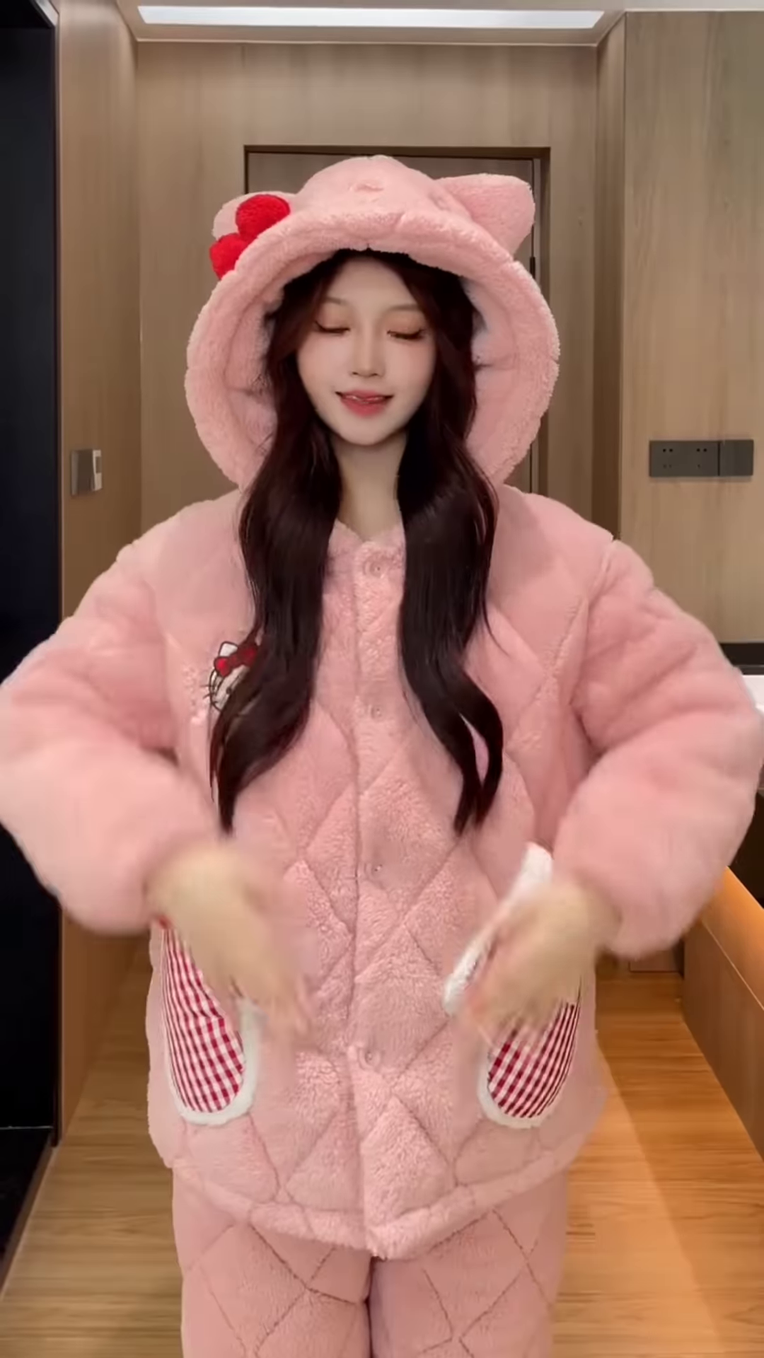 • 🩷 Pink Teddy Variant: Quilted jacket with bear ears, red bows, and checkered pockets paired with matching pants