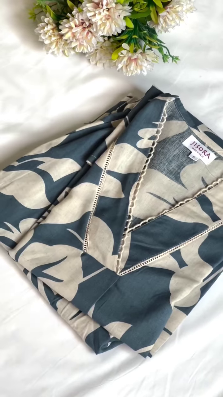 Experience the perfect fusion of comfort and sophistication with this dark charcoal and beige leaf print kaftan-style kurta. This garment is designed for the woman who loves a relaxed, flowing silhouette that doesn’t compromise on style. The kurta is crafted from a premium cotton-rayon blend fabric, offering the breathability of natural cotton and the smooth, elegant drape of rayon. The dark charcoal grey base is sophisticated and grounded, serving as a perfect canvas for the oversized beige leaf prints that cover the entire garment.