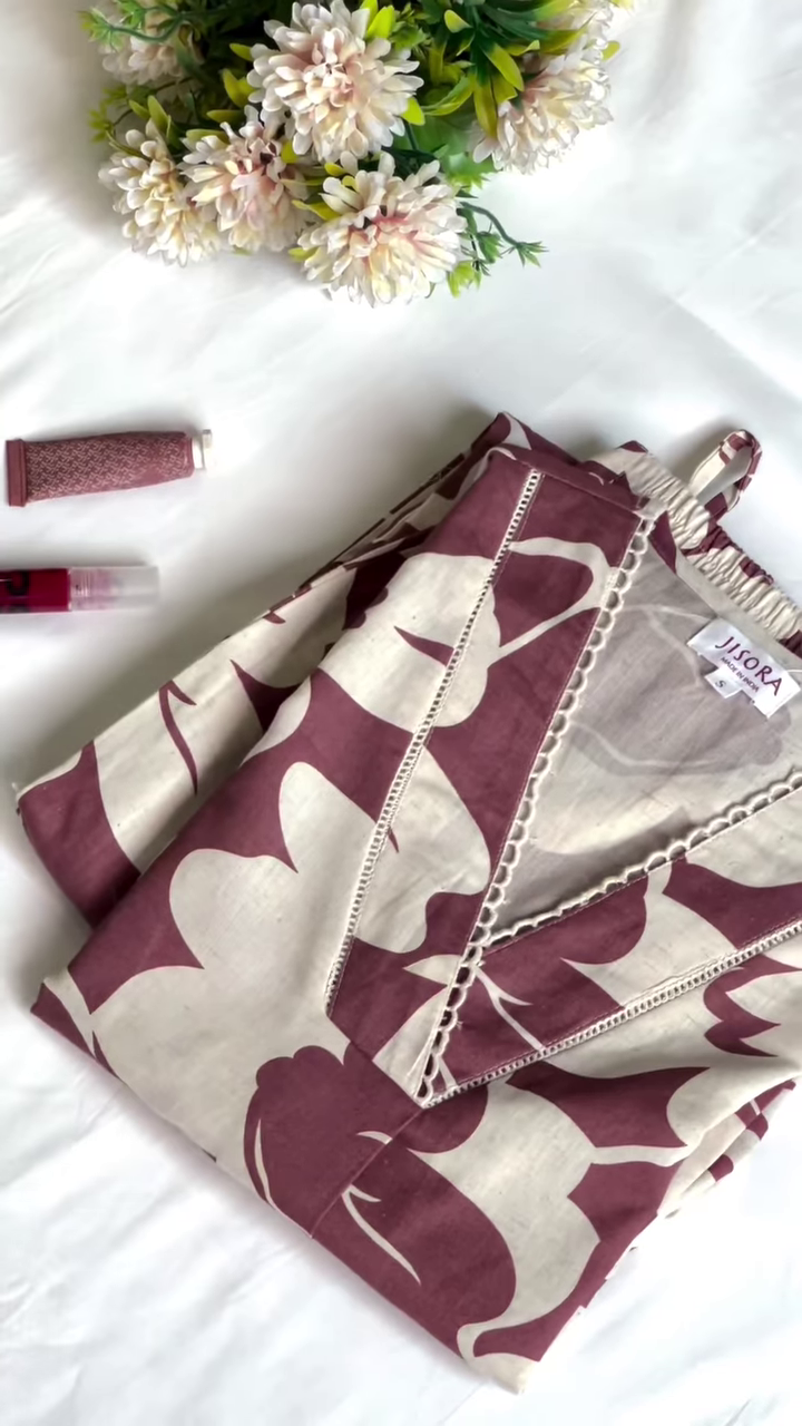 The kurta features a modern V-neckline that is meticulously finished with a delicate white “crochet-style” lace border. This lace detailing adds a touch of femininity and artisanal charm to the bold, graphic print. The silhouette is a relaxed “Kaftan” cut, which provides a comfortable, breezy fit that is universally flattering for all body types. The fabric has a soft-touch finish, ensuring it feels luxurious against the skin even in warmer climates. The oversized leaf patterns are inspired by tropical botanical prints, giving the piece a resort-wear vibe that transitions effortlessly into an ethnic setting.