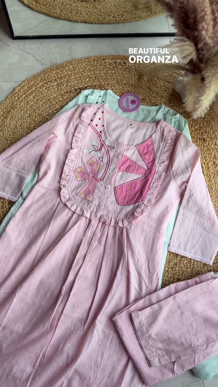 Design & Craftsmanship: This beautiful organza suit set is the perfect blend of elegance and charm. The soft pink kameez features intricate embroidery with a unique patchwork design, complemented by delicate frill detailing along the yoke. Tiny dotted textures on the fabric add a graceful touch, while the full sleeves with lace accents enhance the sophistication.