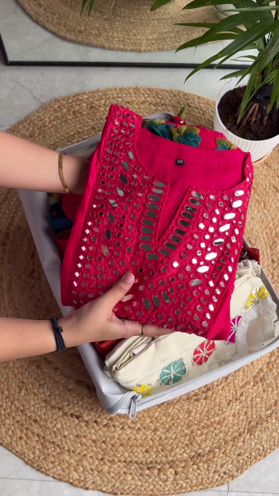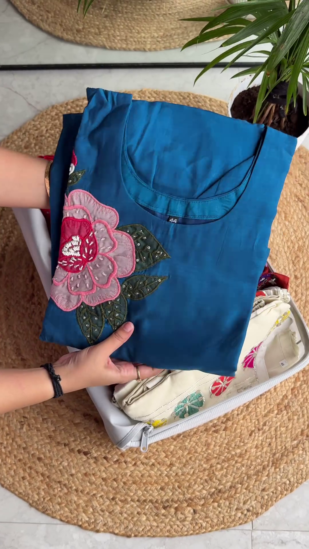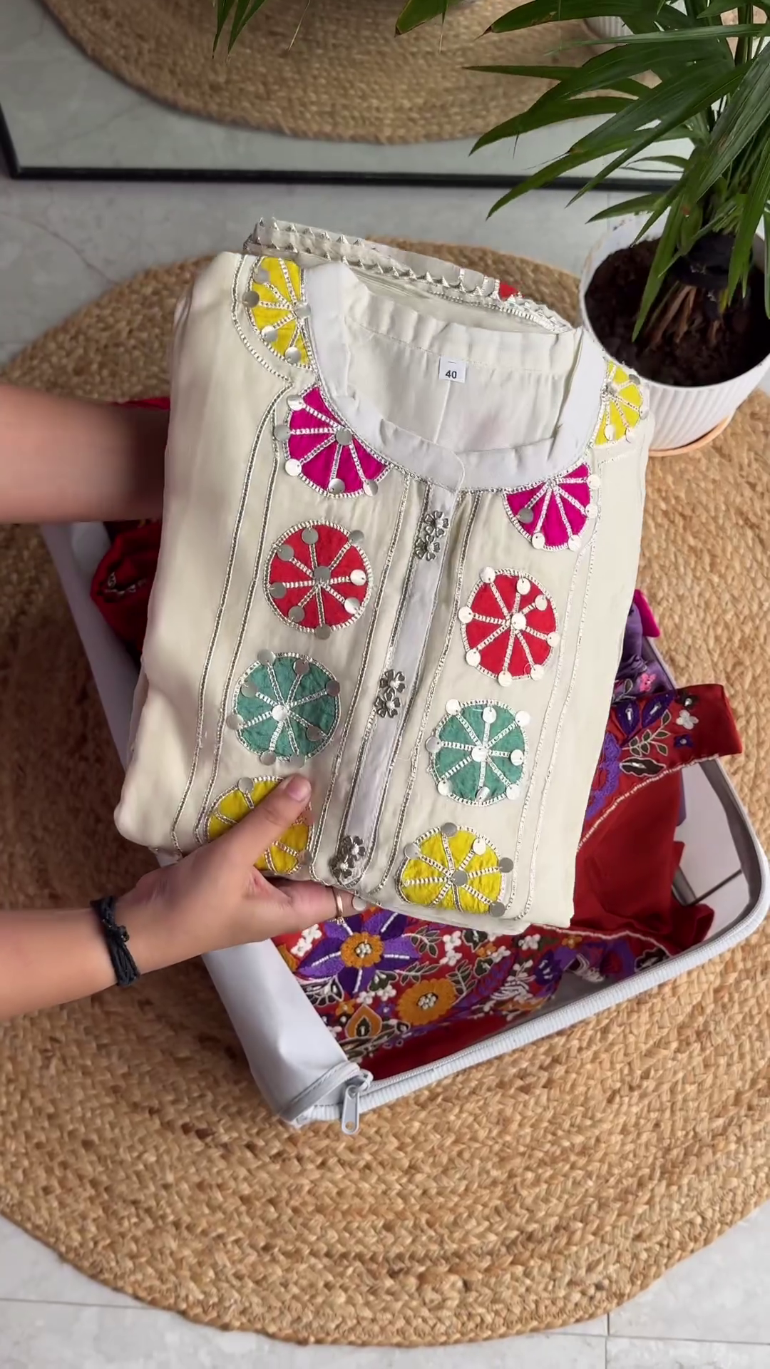 To style this vibrant off-white kurta, pair it with white cigarette pants or a colorful magenta Sharara for a more grand look. Oxidized silver jewelry and colorful bangles will perfectly complement the mirror and thread-work. For hair and makeup, a messy side braid and a bright pink lip will enhance the youthful, festive vibe of the garment. The cotton fabric is durable and easy to maintain, ensuring the colors of the patches stay vibrant over time. This kurta is not just a piece of clothing; it is a wearable celebration of heritage and modern design that will remain a cherished part of your ethnic collection.