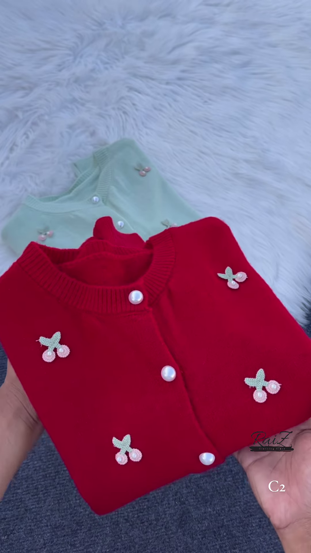 The defining feature of these cardigans is the scattered cherry embroidery. Each tiny cherry motif consists of two soft pink “fruit” pom-poms or embroidered circles and delicate green stems. These motifs are placed across the front and sleeves, creating a whimsical and feminine look. Adding to the luxury of the piece are the elegant white pearl buttons used for the front closure. These iridescent buttons catch the light beautifully and provide a sophisticated contrast to the knit fabric, elevating the cardigan from simple to boutique-quality.