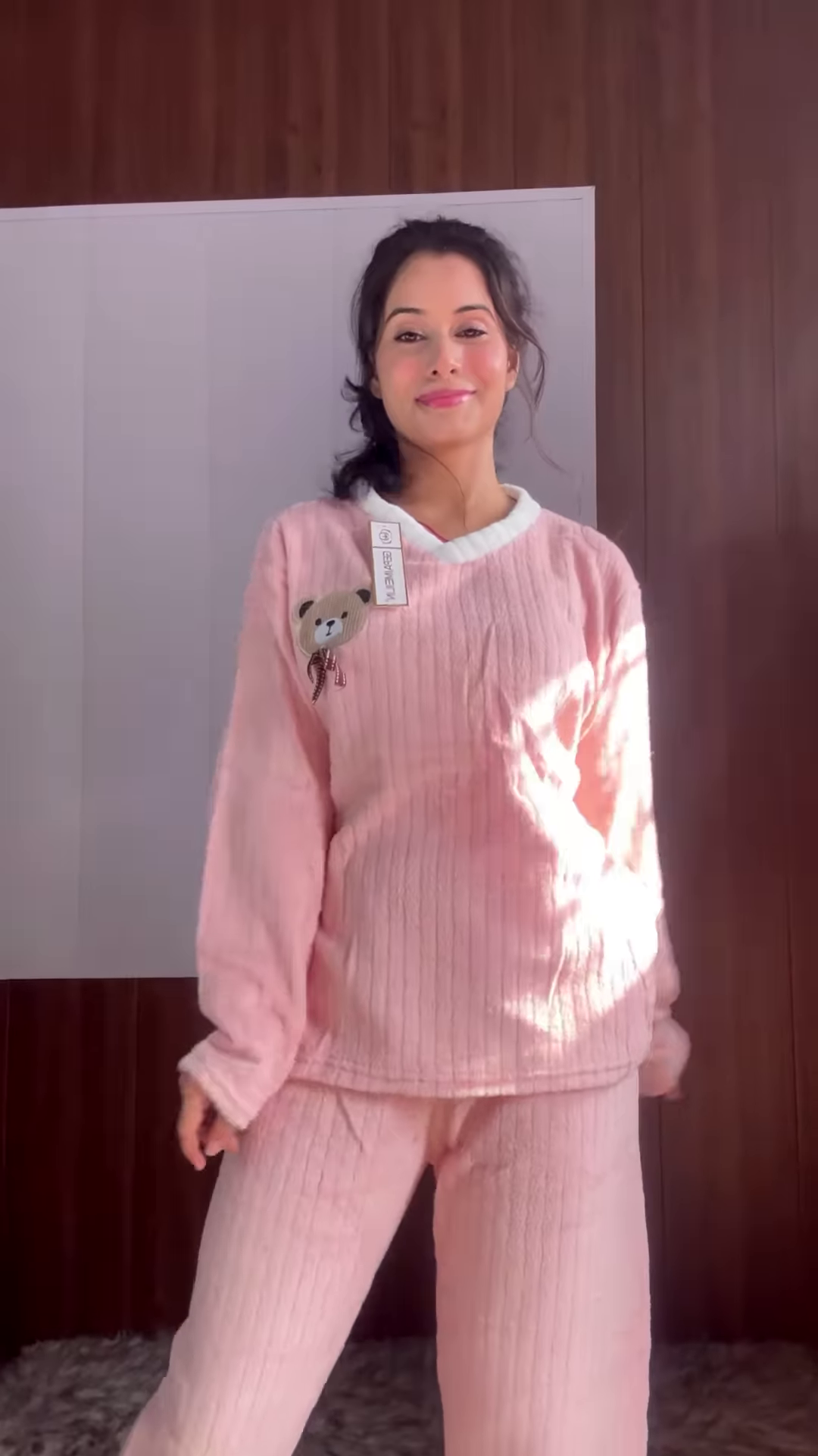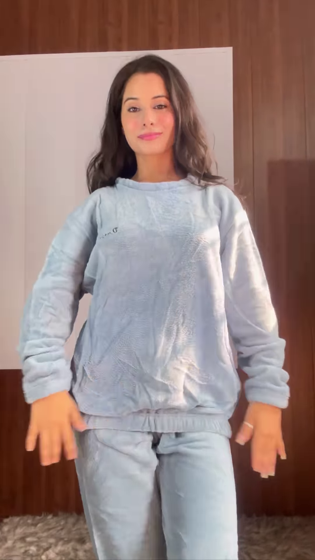 - 🔹 Light Blue Plush: Full-sleeve sweatshirt and matching pants in soft blue fleece + styled on fluffy rug