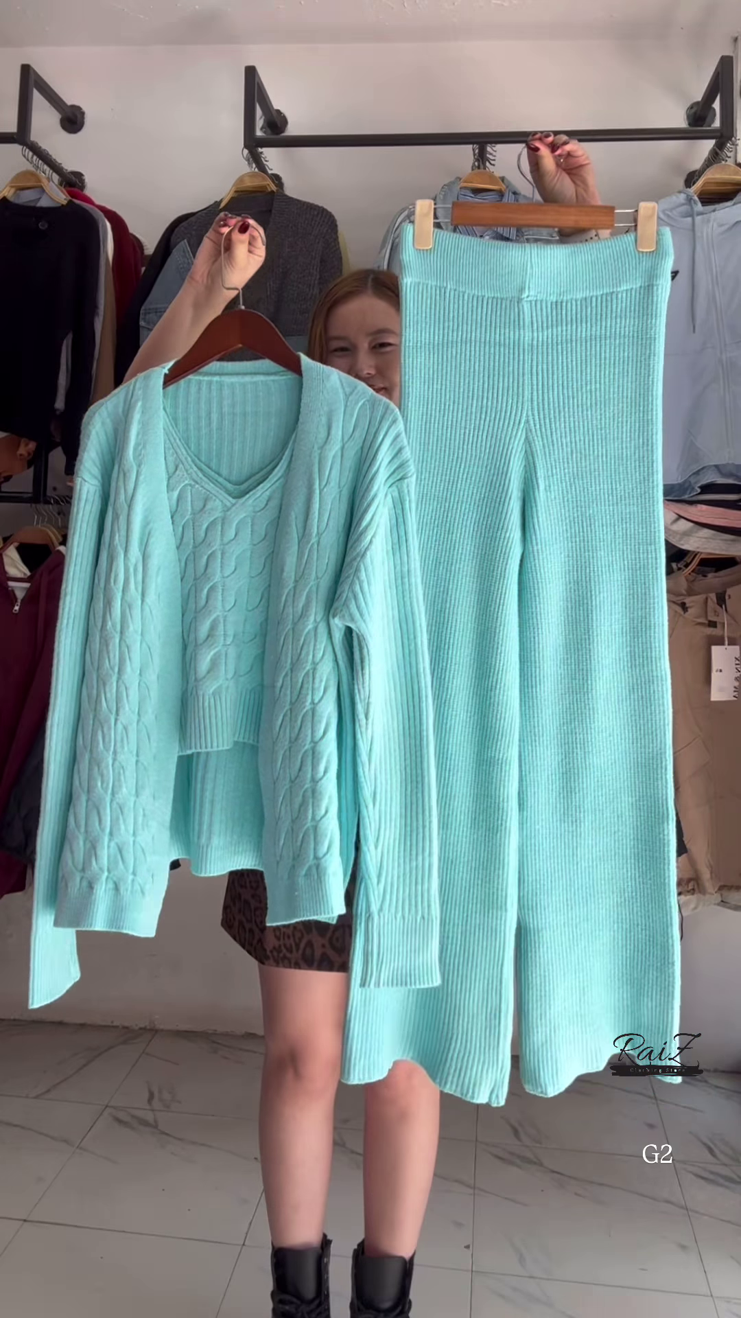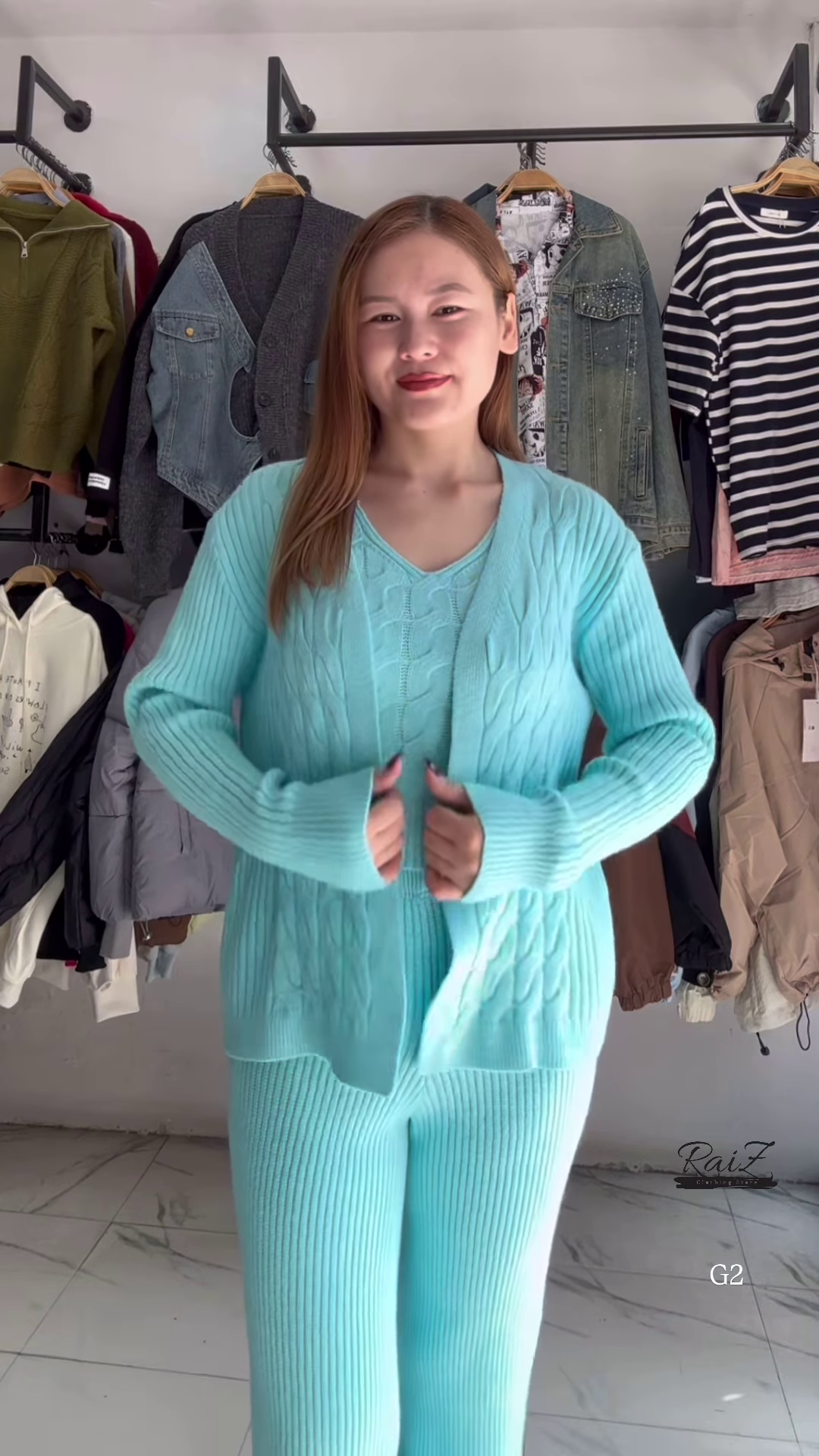 • 🔷 Light Blue: Ribbed knit cardigan + V-neck sweater + matching pants with cable detailing