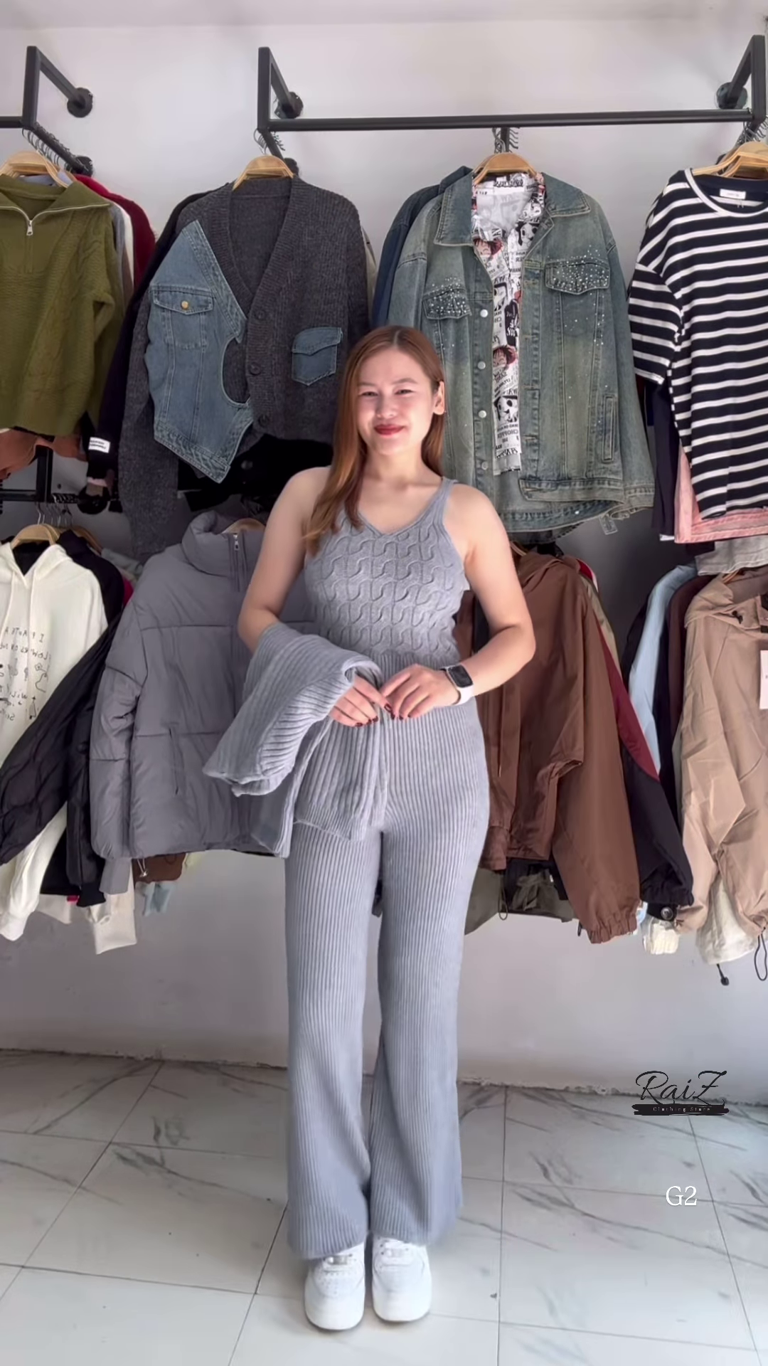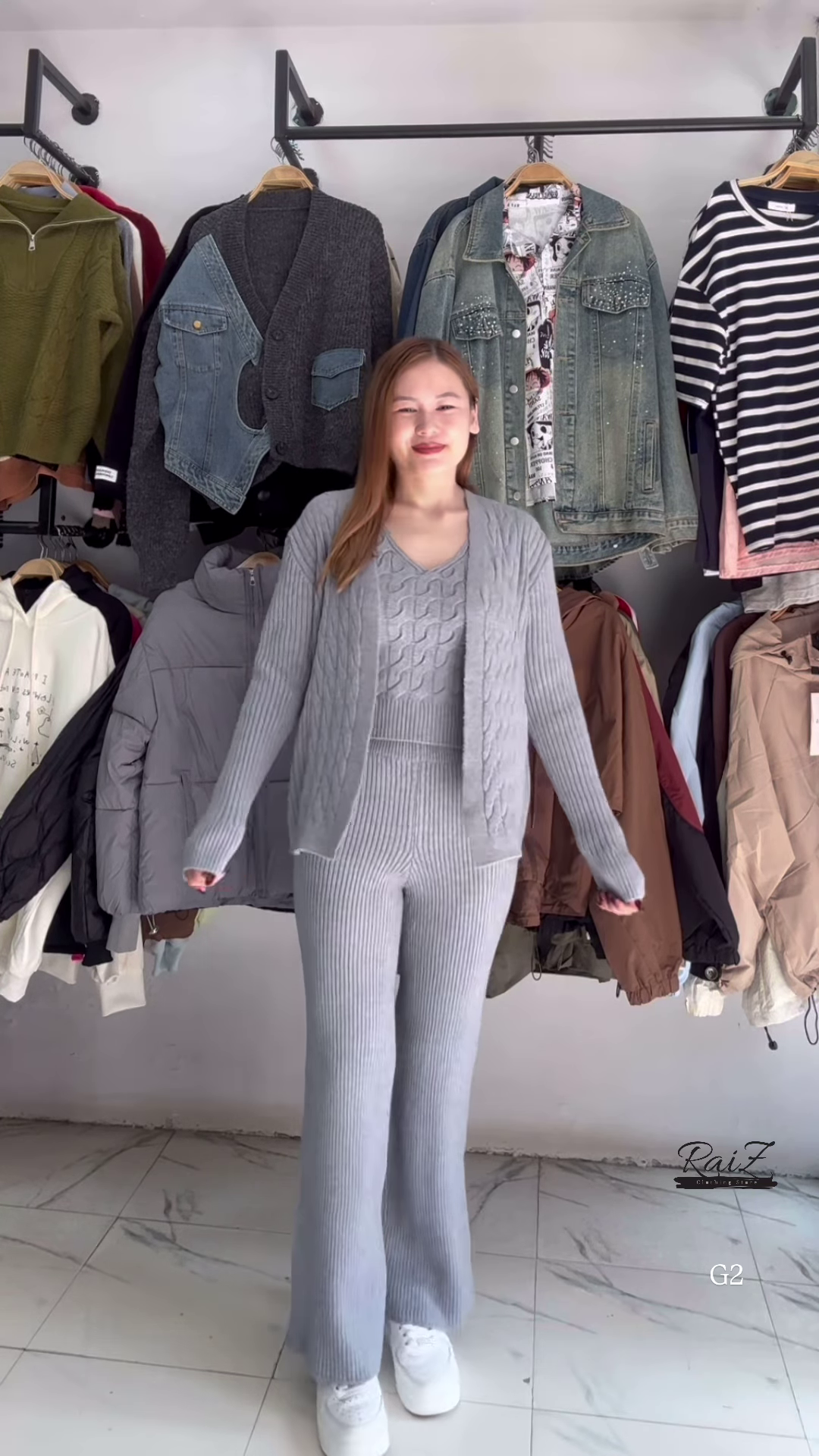 • 🌫 Grey: Coordinated cardigan, V-neck sweater, and flared pants in soft grey knit