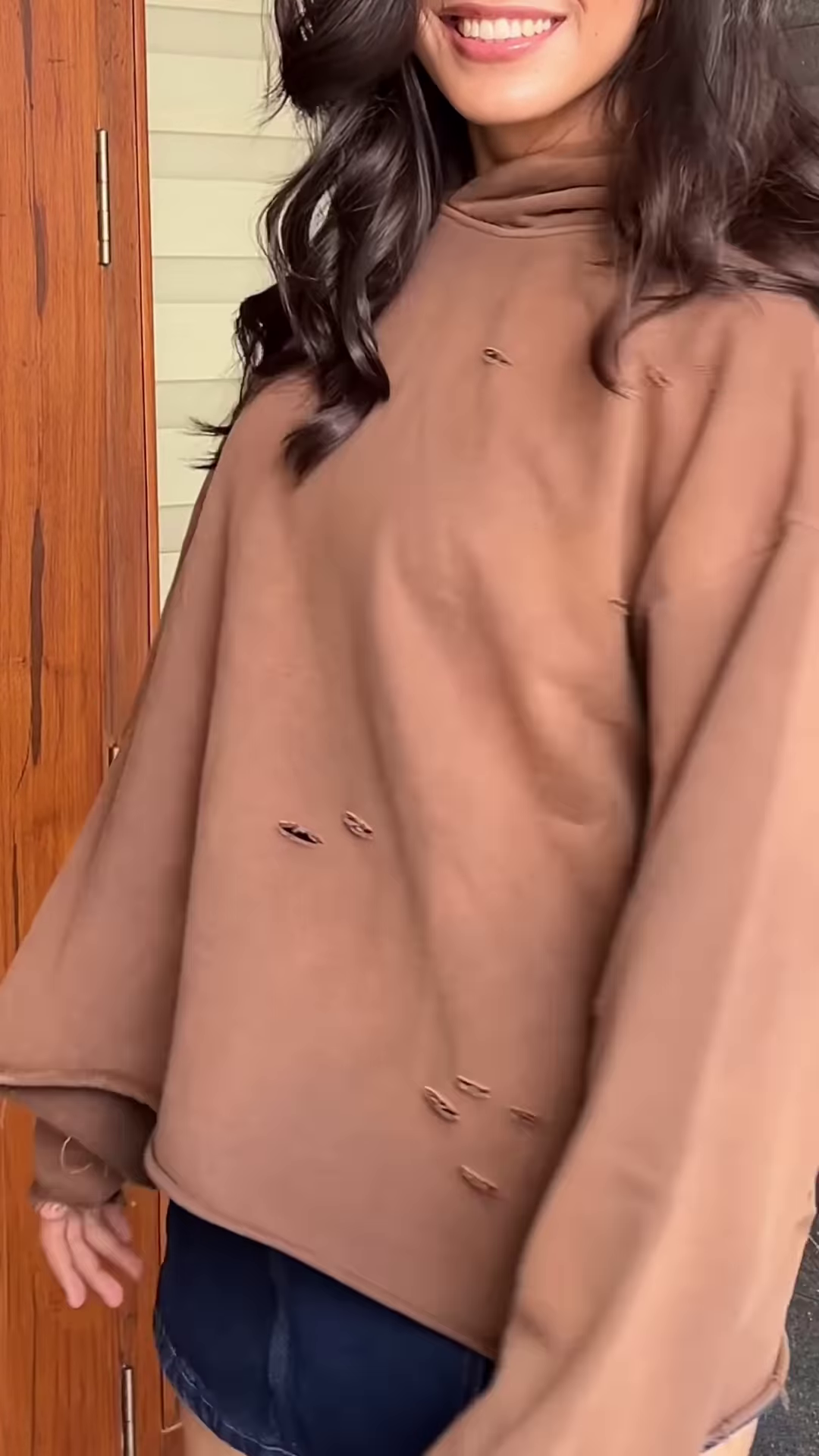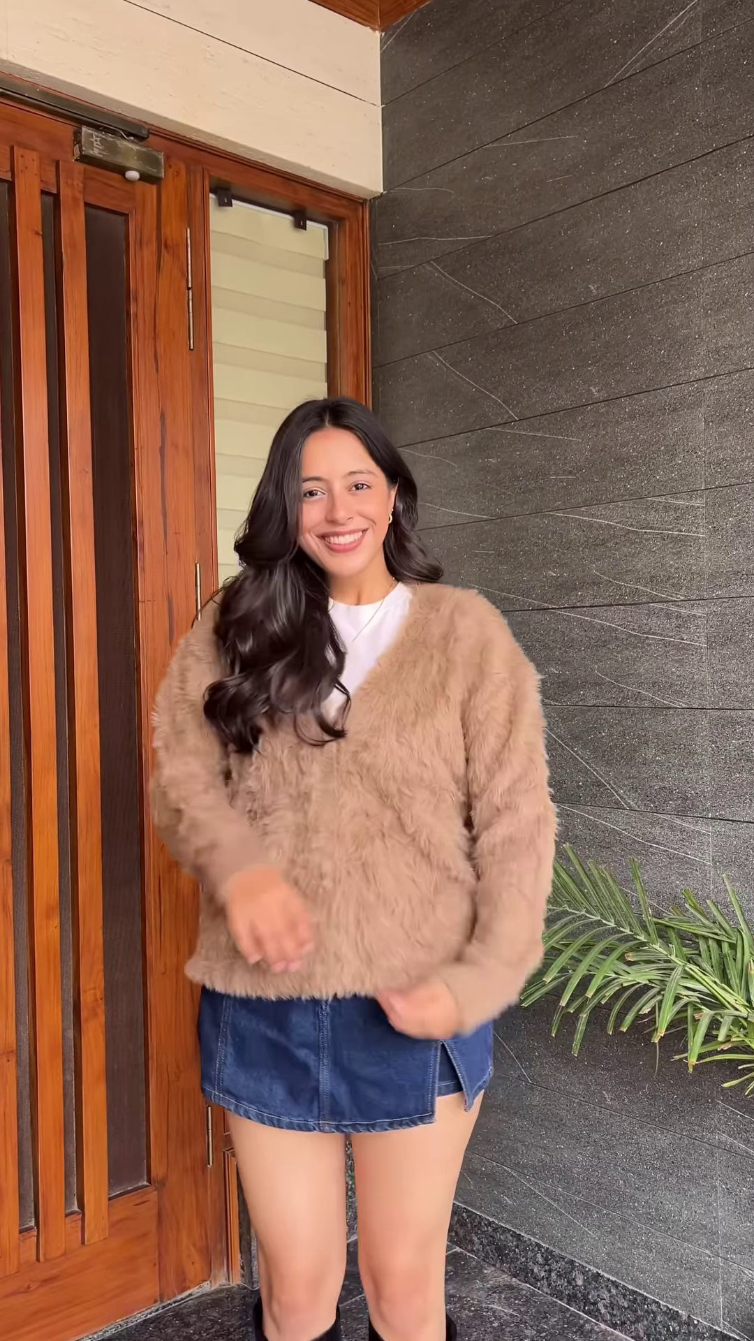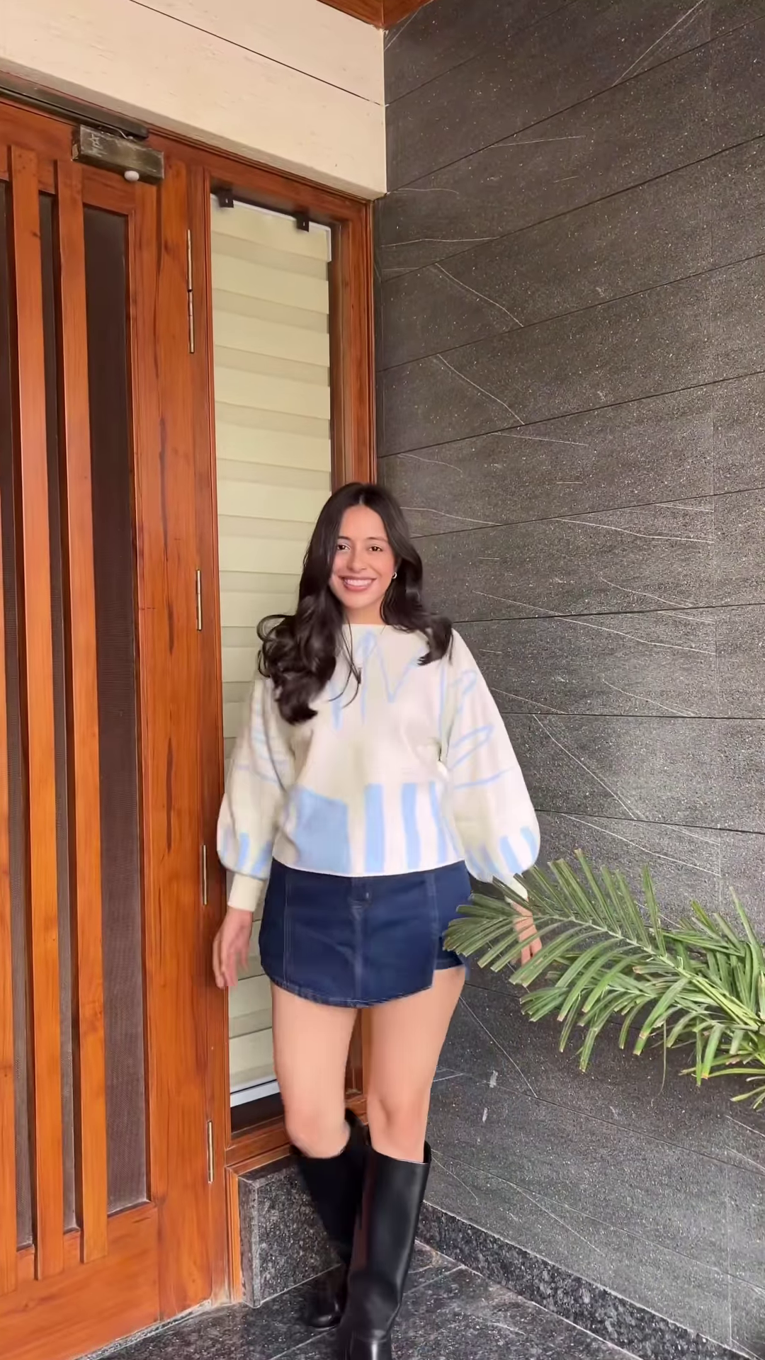 - 🌀 Abstract Cream: Cream knit with light blue abstract wave patterns + styled with denim skirt